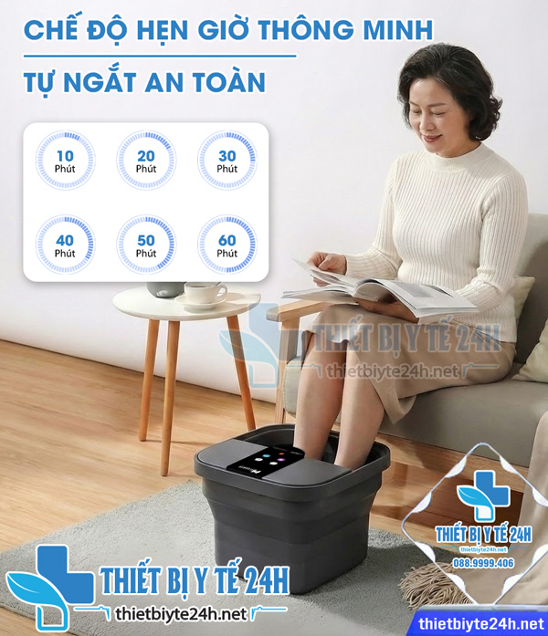 → Bồn ngâm chân có chế độ hẹn giờ gồm 10, 20, 30, 40, 50 và 60 phút, phù hợp với nhiều nhu cầu ngâm chân trong ngày. Tính năng tự động tắt khi hết thời gian giúp bạn thư giãn an tâm hơn, tránh quên tắt máy, đồng thời góp phần tiết kiệm điện năng môi trường sử dụng khác nhau, kể cả không gian hạn chế.
