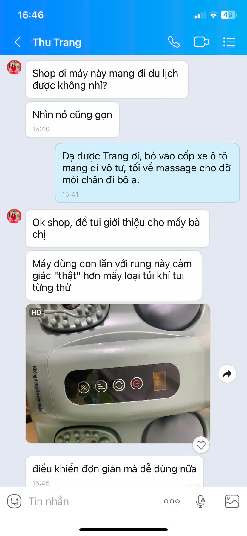 Trời ơi bắt đền sop đấy, bảo mua cái máy về có mình mình dùng vì cả ngày đi cao gót mỏi chân mà thành ra 2 vợ chồng tranh nhau dùng, có khi phải đặt thêm cái nữa
